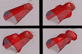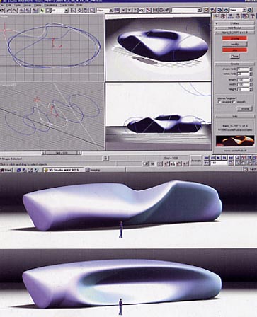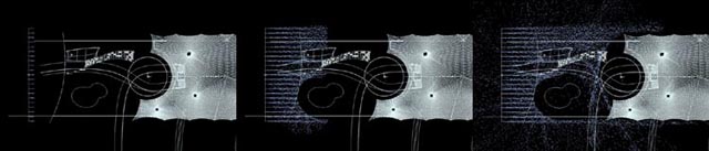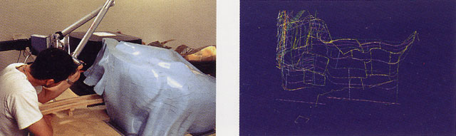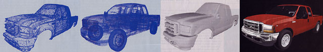 Ricostruzione digitale di un modello Ford da utilizzare in produzioni pubblicitarie. Da sinistra: nuvola di punti derivante da scansione 3D, modello NURBS, Shading e Texturing. (Fonte: Computer Gazette 03/02)