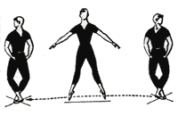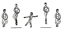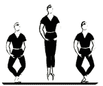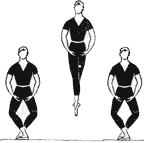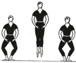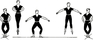 Los brazos, antes de saltar, se bajan en orden entonces para abrirse en resto juntos en las piernas.