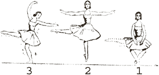 Alzare le braccia in prima posizione, inclinare la testa verso la spalla sinistra e dirigere lo sguardo sulle mani. Poi, stendere la gamba destra avanti con la punta a terra (la punta della gamba che lavora opposta al tallone di sostegno); alzare il braccio sinistro in terza posizione ed aprire il destro in seconda; girare la testa a destra; seguire con lo sguardo la mano destra; e piegare leggermente il corpo indietro.