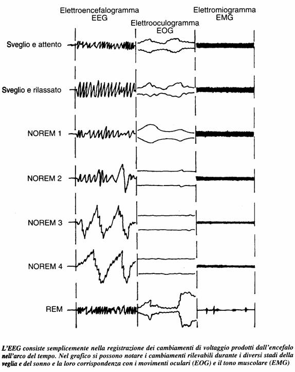 Dal momento che i diversi tipi di EEG si succedono con regolarità, è possibile affermare che il sonno ha uno svolgimento ciclico: una volta addormentatosi, il soggetto si immerge nel sonno più profondo, passando rapidamente attraverso i vari livelli; in seguito entra, senza interrompere il sonno, in uno stadio successivo caratterizzato da un EEG simile a quello di un individuo sveglio e attento, identificabile dal rapido movimento degli occhi. E' questo il momento in cui si sogna. Successivamente tutto il ciclo si ripete, fino ad un totale che va da 4 a 6 volte per notte, con una durata approssimativa di circa 90 minuti per ciascuno. Lo stadio del sonno caratterizzato da un EEG molto attivo, da movimenti oculari e dalla produzione dei sogni, fu designato da William Dement. Da quel momento il sonno fu suddiviso in fasi REM e fasi NOREM. Poichè durante il sonno REM si produce un EEG molto simile a quello registrabile in condizioni di attenzione senza però che il soggetto si svegli, questo stadio viene anche definito pseudosonno. E' stato provato che sia nell'uomo che negli altri mammiferi queste fasi del sonno si succedono le une alle altre in cicli che si completano con il sonno REM: nel sonno abbiamo il verificarsi di una fase REM ogni quattro fasi NOREM. I periodi REM quindi occupanno il venti pr cento di tutto il sonno.