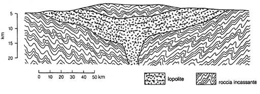 Figura 14. Sezione trasversale di un lopolite, un'ampia intrusione a forma di scodella, con un canale di alimentazione centrale. I lopoliti sono costituiti  da rocce femiche, a volte sottoforma di intrusioni stratificate. I margini possono essere concordanti o discordanti