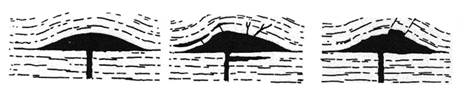 Figura 15. Sezioni schematiche di laccoliti, con gli strato sovrastanti piegati a cupola e con o senza apofisi.