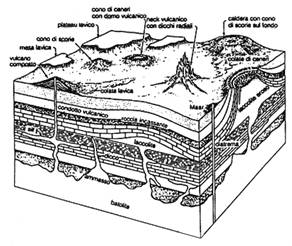 Figura 16. Blocco - diagramma riassuntivo delle diverse strutture plutoniche e vulcaniche (secondo R.G. Schimdt e H.R. Shaw, U.S. Geological Survey).