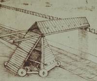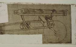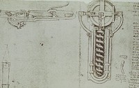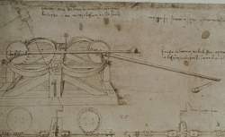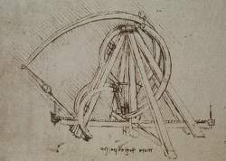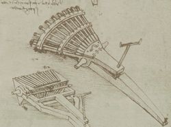 Balista multipla La catapulta doppia, a cucchiaio e a fionda, è uno splendido esempio del concetto di forza che Leonardo voleva dare alle sue macchine da guerra. Le balestre vengono avvicinate e tese mediante la torsione di corde provocata con il movimento di ruote dentate e vite senza fine. Successivamente si innestano i due bastoni e si caricano le pietre. Un solo colpo di mazzuolo, provocando la tranciatura delle due zeppe, fa abbassare il bilanciere che trascina in basso i due semiassi. Sganciate così le due ruote dentate dalle relative viti senza fine, si provoca il contemporaneo lancio dei sassi.