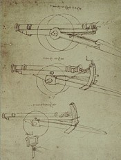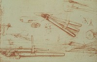 Cannone a tre canne Al tempo di Leonardo i cannoni erano impiegati soprattutto negli assedi, sia per il loro peso, sia perché richiedevano troppo tempo per la carica ed erano quindi poco utili sul campo di battaglia dove i movimenti delle truppe erano troppo rapidi. Leonardo apportò delle modifiche che prevedevano di aumentare la qualità di fuoco e regolavano velocemente il tiro. Il modello rappresenta un altro tipo di artiglieria leggera: si tratta di un affusto facilmente manovrabile con tre bocche da fuoco ed avancarica. Per migliorare la precisione di tiro le tre bocche possono essere ampiamente regolate in altezza tramite un sistema a pioli.