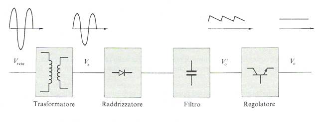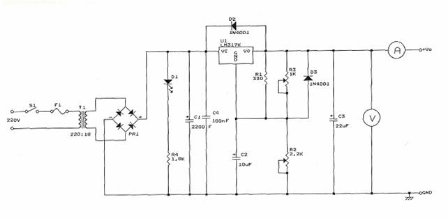 Utilizzando un trasformatore per diminuire il valore picco-picco della tensione di rete, si utilizza un ponte di Gretz per raddrizzare l'onda sinusoidale in una doppia semionda; con i condensatori si impediscono disturbi dalla variazione di tensione di rete e dalle variazioni del carico. I diodi D2 e D3 servono per facilitare la scarica dei condensatori C2 e C3 quando per esempio avviene un cortocircuito. Il regolatore di tensione utilizzato è LM317K, in grado di fornire una tensione variabile da circa 0 a 15V; si può schematizzare nel seguente modo: