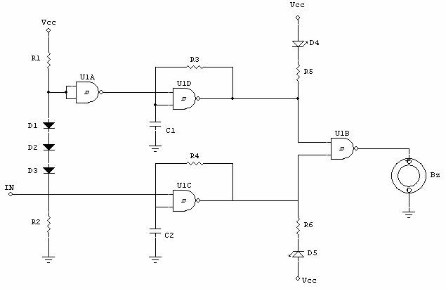 Osservando lo schema, l'uscita della porta U1A va in ingresso ad un'altra porta a trigger di Schmitt, U1D, che funge da generatore di tono, mentre il segnale immesso nell'IN va direttamente in ingresso ad un'altra porta, U1C: si tratta precisamente di due oscillatori ad onda quadra, costituiti da porte NAND. Trattandosi, appunto, di porte NAND, basta che uno solo dei due ingressi sia a livello basso per bloccare l'uscita a livello alto. Supponiamo che sia in ingresso che in uscita vi siano livelli logici alti. Il condensatore inizia a caricarsi, con costante di tempo pari a RC, fin quando la sua tensione non raggiunge quella di soglia superiore del trigger. A questo punto l'uscita commuta a livello basso ed il condensatore inizia a scaricarsi con uguale costante di tempo, finché non giunge ad avere una tensione pari alla tensione di soglia inferiore del trigger. Il ciclo va così ripetendosi.