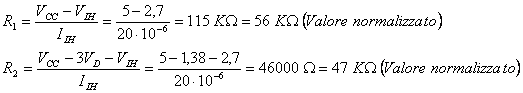 In ingresso, si è detto, vi è una porta a trigger di Schmitt, con alimentazione 5V. Troviamo poi le resistenze di pull-up (R1) e di pull-down (R2), di valori pari a: