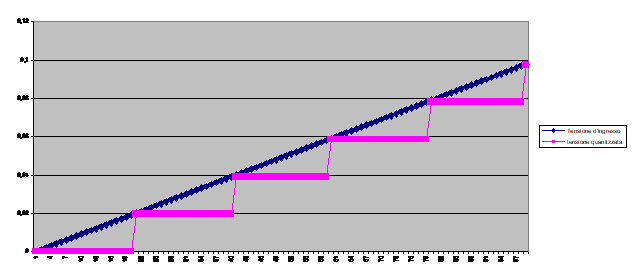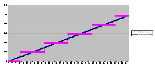 Come si può notare, l'errore massimo che si commette, confrontando la tensione quantizzata con la tensione d'ingresso è proprio pari al quanto.