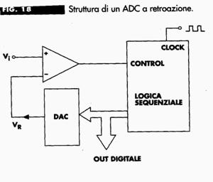 Il principio di funzionamento di un ADC è rappresentato in figura. Il blocco logica sequenziale è un blocco che è in grado di generare tutte le combinazioni possibili degli n bit dell'ADC. Queste sequenze di bit vanno in ingresso ad un DAC che genera la corrispondente tensione in uscita. Appena tale tensione diventa maggiore o uguale a quella di ingresso, l'uscita del comparatore va bassa bloccando il circuito sequenziale e congelando la stringa di bit che si voleva ottenere come risultato della conversione.