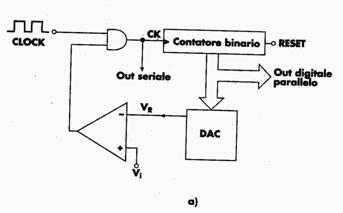 In questo ADC il circuito di logica sequenziale è un contatore binario, pilotato da un clock. Ad ogni impulso di clock il contenuto del contatore binario si aggiorna . il numero contenuto nel contatore passa al DAC. Quando la gradinata prodotta dal DAC raggiunge e supera il valore di tensione Vi, l'uscita del comparatore va a zero per cui blocca a zero l'uscita della porta AND, impedendo al clock di raggiungere il contatore binario. In tal modo l'uscita del contatore binario rimane congelata. Per far partire una nuova conversione occorre resettare il contatore binario mediante il segnale di RESET.