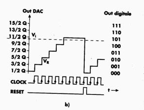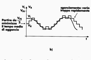 se la tensione d'ingresso è minore di quella fornita dal DAC, l'uscita del comparatore è a zero per cui il contatore funziona in modalità down e la tensione di uscita del DAC tende a diminuire. Se la tensione da convertire diventa superiore a quella del DAC, l'uscita del comparatore va ad 1 ed il contatore viene impostato in modalità up. Nella figura seguente è mostrato il processo di aggancio