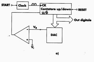 questo è lo schema di principio dei convertitori A/D a retroazione. L'esempio più semplice è il counting ADC o convertitore a conteggio o a gradinata i l cui schema di principio è il seguente