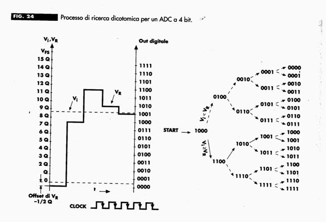 Data la tensione Vi d'ingresso si cerca di stabilire innanzitutto seil bit più significativo deve stare a 1 o a zero. Si pone il bit più significativo ad 1 e tutti gli altri bit a zero. Il DAC darà la tensione corrispondente e il comparatore confronterà le due tensioni. Se la tensione di uscita del DAC supera la tensione di ingresso da convertire il comparatore porta la sua uscita d 1 costringendo il SAR a porre l'MSB a 0. se la tensione di uscita del DAC è inferiore a quella di ingresso da convertire, il comparatore pone la sua uscita ad 1 lasciano il MSB del SAR ad 1. a questo punto il SAR pone il bit successivo (il bit 6) ad 1 e si esegue lo stesso controllo e così via fino a giungere a determinare il bit meno significativo. Supponiamo ad esempio di voler convertire una tensione d'ingresso pari a 4,2 volt. Il SAR pone l'MSB ad 1(il bit 7) e tutti gli altri bit a zero. Dalla tabella notiamo che ciò comporta una tensione in uscita dal DAC pari a 2,5 volt, per cui l'uscita del comparatore sarà 1. il SAR pone allora il bit 6 ad 1. dalla tabella vediamo che ciò corrisponde ad una tensione in uscita dal DAC pari a 3,75 volt. L'uscita del comparatore è ancora ad 1 per cui la scelta del bit 6 rimane inalterata. Ora il SAR prova a porre il bit 5 ad 1. ciò corrisponde ad una tensione in uscita dal DAC pari a 4,375 volt. Stavolta la tensione di uscita dal DAC è inferiore alla tensione che si vuole convertire per cui l'uscita del comparatore va a zero. Ne deriva che il SAR riporta il bit 5 a zero. Ora il SAR porta il bit 4 ad 1. ciò corrisponde alla stringa 11010000 e ad una tensione in uscita dal Dac pari a 4,0625 volt. Questa tensione è inferiore a quella d'ingresso per cui l'uscita del comparatore rimane a livello alto e il bit 4 rimane a livello logico 1. successivamente il SAR prova a porre il bit 3 a 1. la stringa 11011000 corrisponde ad una tensione in uscita dal Dac pari a 4,21875 volt. L'uscita del comparatore va bassa ed il bit verrà riportato a zero. Ciò avverrà anche per i bit 2,1 e 0. in definitiva il risultato della conversione sarà la stringa 11010000.