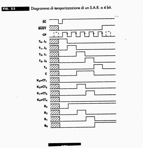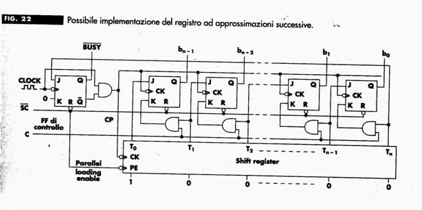 possiamo notare n flip flop di tipo JK ed un flip flop di controllo alla sinistra dello schema che decide se il clock di sistema può raggiungere o meno gli altri flip flop. Supponiamo di dare avvio alla conversione mediante il segnale SC (start of Convertion). Come si può vedere dallo schema, SC è collegato al segnale di Reset di ogni flip flop per cui resetta tutti i contatori e quindi il risultato dell'ultima conversione effettuata. Si noti che SC funge anche da segnale PE (Parallel Loading Enable) per lo shift register cioè consente che il registro venga caricato dai suoi ingressi. Ma i suoi inglesi sono bloccati in modo che il bit meno significativo venga posto ad 1 e gli altri a 0. in sostanza i flip flop vengono azzerati e lo shift register viene caricato con la stringa 00000001. poiché il flip flop di controllo è stato resettato la sua uscita Q si porta a zero e viene usata come si può vedere dallo schema per generare un segnale BUSY attivo basso che indica, finché sta a zero, che l'ADC è impegnato nella conversione. L'uscita Q negata sta invece ad 1 e, costituendo uno degli ingressi di una porta AND consente al clock di sistema di raggiungere gli altri flip flop e lo shift register. Ora consideriamo il flip flop più significativo: J si trova ad 1 perché corrisponde al bit meno significativo in uscita dello shift register, mentre come si può notare dallo schema K è pari a 0. allora bn-1=1 e gli altri bit si portano a zero. Ad un nuovo ciclo di clock viene attivato lo shift register per cui il bit 1 passa da T0 a T1. per cui per il flip flop corrispondente al bit bn-2 J=1 e K=0, allora bn-2 viene portato ad 1. intanto il DAC ha provveduto a generare la tensione corrispondente alla stringa 10000000. ora se tale tensione risulta superiore a Vi, l'uscita del comparatore si trova ad 1, per cui C=1, allora per il flip flop corrispondente al bit bn-1 si ha che J=0 perché corrisponde a T0 che per effetto dello shift è diventato 0, mentre K è il risultato della AND fra T1 che adesso è pari ad 1 per effetto dello shift e di C=!,. l'uscita della And è allora pari a 1 per cui J=0 e K=1 e il flip flop viene resettato per cui bn-1 torna a zero. se invece la tensione VR, corrispondente alla stringa 10000000, è inferiore alla tensione Vi, si ha C=0, l'uscita della AND =0, per cui J=0, K==, e il flip flop resta nelo stato precedente. Abbiamo dunque fatto in modo di variare automaticamente il valore del bit più significativo. Via via che i vari impulsi di clock fatto shiftare l'uno nello shift register lo stesso processo avverrà per ogni flip flop, per cui i vari bit verranno settati o resettati automaticamente. Quando il bit di controllo raggiunge il bit Tn, poiché questo è collegato all'ingresso J del flip flop di controllo tale flip flop viene settato, l'uscita BUSY torna ad 1 ad indicare che la conversione è terminata, la sua uscita Q negata va a zero ed il clock non si può più propagare al SAR bloccando la conversione.