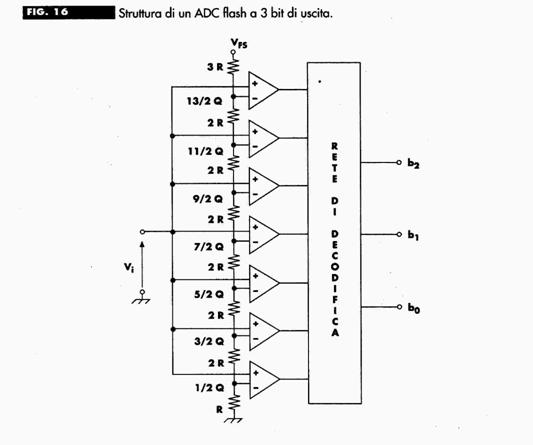 come si può vedere dalla figura abbiamo una batteria di comparatori di tensione. La tensione da convertire viene mandata in parallelo a tutti i comparatori. Ogni comparatore la confronterà con una tensione di riferimento ottenuta da un partitore resistivo. Come si può notare dalla figura si vuole fare in modo che le transizioni dei bit avvengano a metà dell'intervallo di quantizzazione.